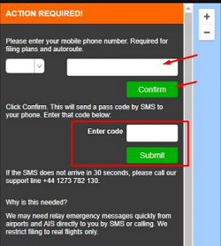 Your contact details must be validated before proceeding (you cannot file flight plans until this is done). - Select the country code from the list available in the left-hand box.