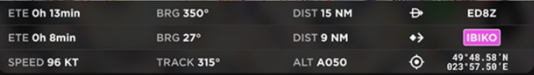 This lists the target waypoint for each stage of the route, with the fuel consumption, bearing, distance, and estimated flight and arrival times. The current stage of the route being flown is highlighted.